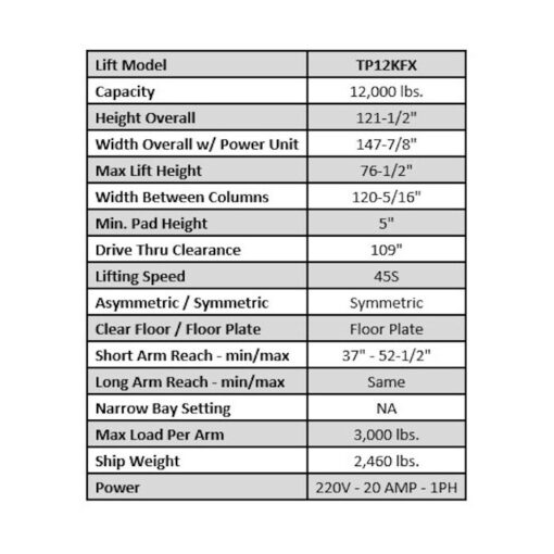 What do you get when you combine all the features of a premium brand two post lift, but without the price? You’re looking at it. It’s the ASEplatinum model TP12KFX. This ASEplatinum lift has the popular chain over hydraulic drive feature that the premium brand lifts offer, as well as extra tall carriages for sake of longevity and durability. Lower column height at only 121 inches tall means you’ll be able to fit it under lower ceilings. No shut off bar up top means you’ll be able to raise taller service trucks and vans without tripping the shut off bar before the vehicle reaches full lifting height. Frame pads are the durable steel pads with the reliable rubber pads to minimize damage to the underside of the automobile and to assure a safe, sturdy resting place for the frame. Huge baseplates at the bottom of each column provides maximum safety and stability. Rugged anchoring system is included. This 12,000 lbs. capacity lift really delivers and is at a price that won’t put a dent in your wallet.