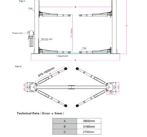 • Base width 18.89″ column thickness of steel 3/16″ carriage thickness of steel 15/64″;arms thickness of steel 15/64″ front arm Front Arm 30.7″ to 48″ Rear Arm 30.7″ to 48″ r min pad height: 3-7/8″;lift height max: Lift height max: 70″, with adapters up to 74″ drive-thru width clearance: 99 19/32″ Time to full rise: 20-60 sec shipping weight: 1311 lbs